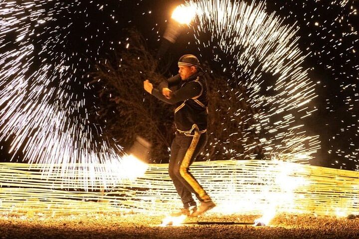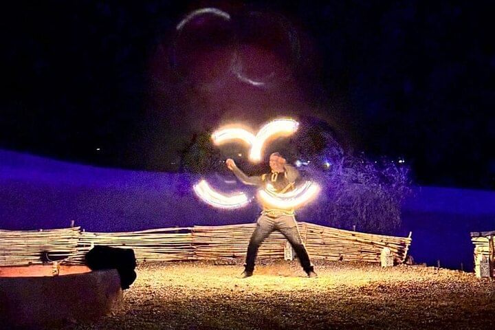 An evening of adventure and culture in the Agafay Desert — camel trekking, delicious Moroccan flavors, and dazzling fire entertainment.