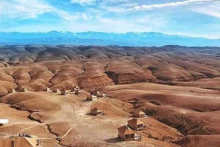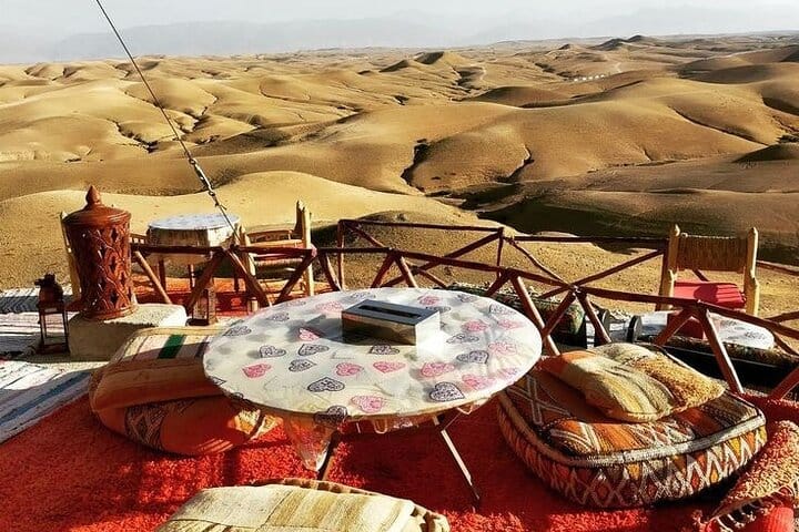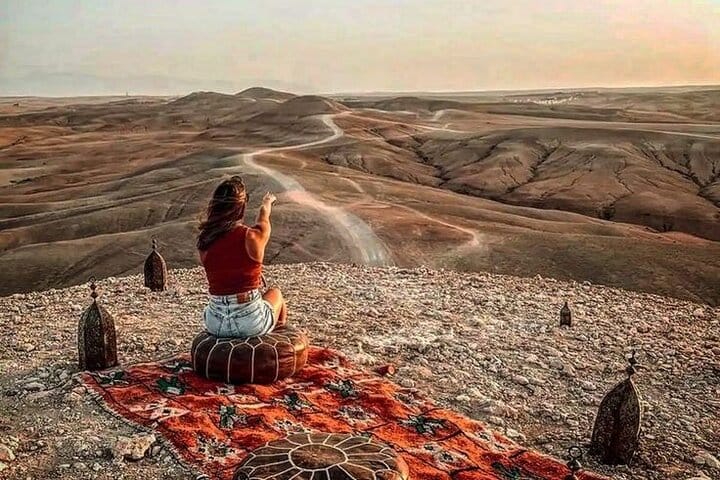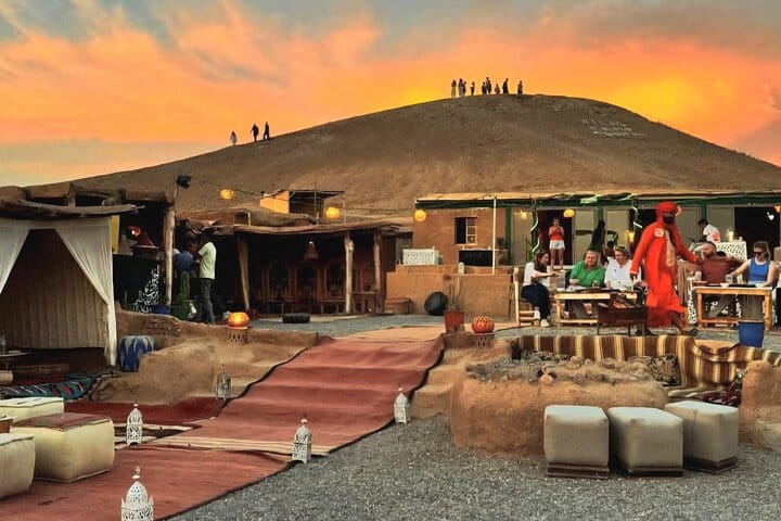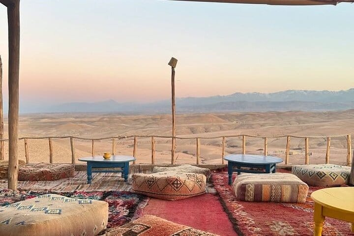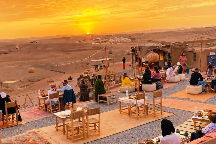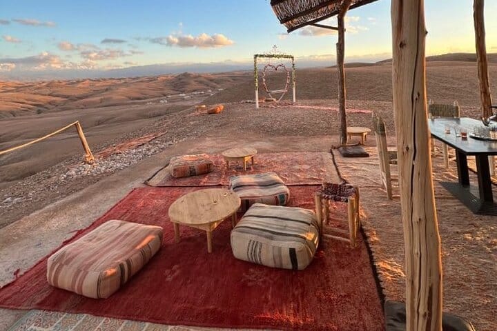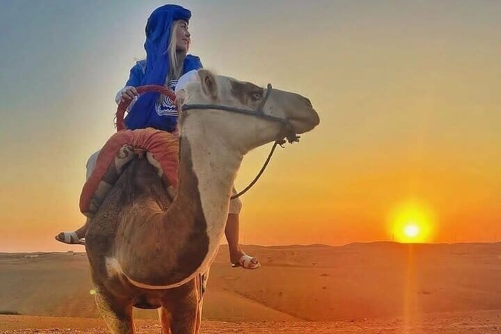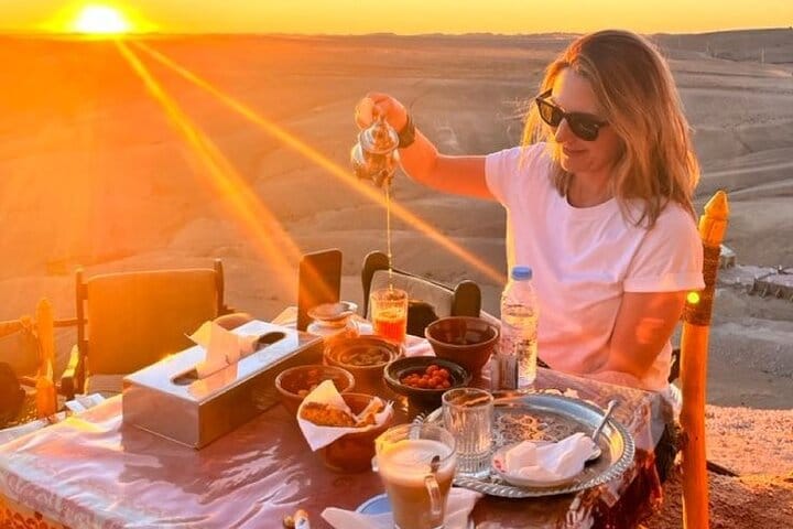 This is not just a desert tour—it’s a complete sensory experience. Watch the sunrise over the golden Agafay Desert from the back of a camel, an unforgettable moment few get to experience. Unlike other tours, you’ll see a Moroccan lady prepare breakfast right in front of you, giving you an authentic glimpse into local culinary traditions.